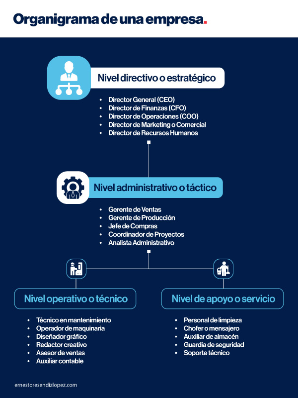 • Director General o CEO: máxima autoridad de la empresa, responsable de la estrategia global y de la toma de decisiones clave.